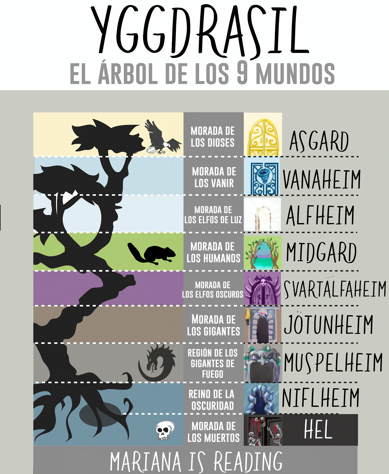 Asgard. Midgard. Jötunheim. Vanaheim. Alfheim. Svartalfheim. Helheim. Las creencias de los pueblos nórdicos relacionadas con la cosmología, se dirigen a explicar no solo el origen sino también la evolución del universo y las leyes que ordenan el funcionamiento del mundo físico. Nosotros te llevaremos a conocer los 9 mundos de la.