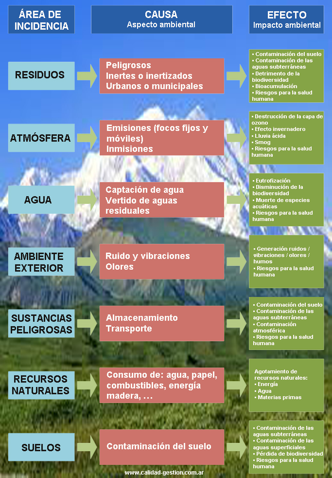 Para poder realizar con éxito esta identifi cación y evalua-ción de sus aspectos ambientales, la organización debe tener clara cuáles son sus posibles áreas de incidencia y, en consecuencia, sus los impactos ambientales que genera o puede generar. A continuación se exponen las posibles causas-efectos