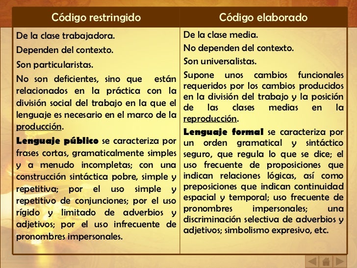 Desde la lingüística, Bernstein entiende los códigos de la siguiente manera: Los códigos definen las posibilidades a través de las cuales los elementos sintácticos predicen la organización de significados. En el código restringido, la estructura se puede identificar de acuerdo con el contexto. En el código elaborado se requiere de la.