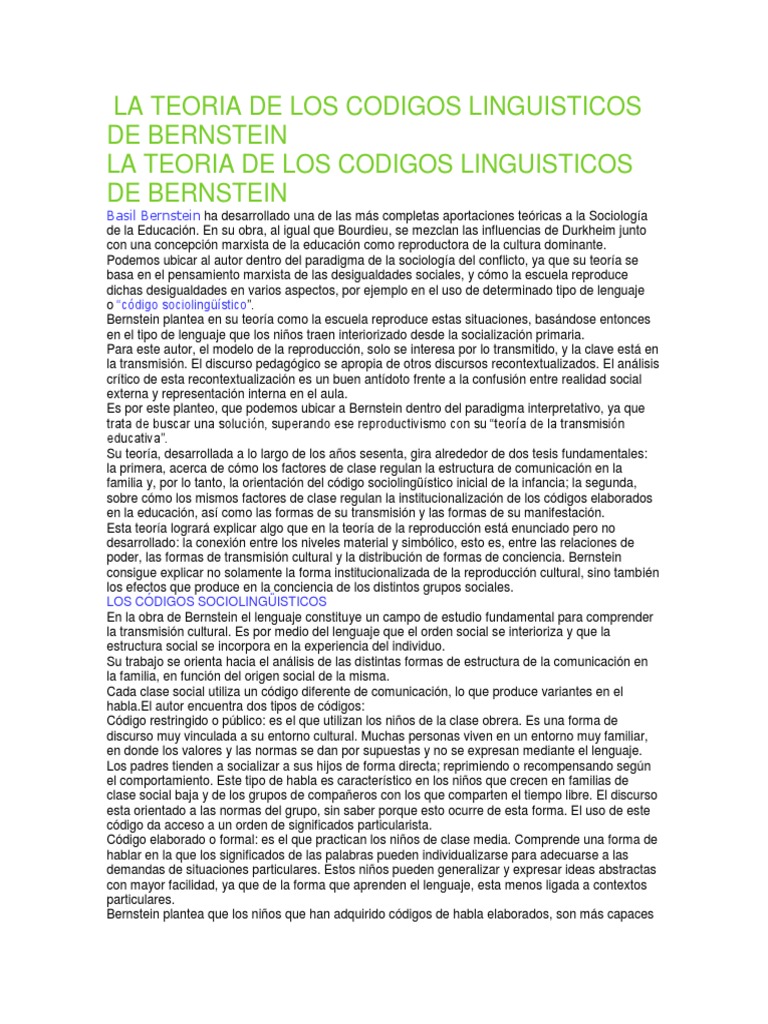 La Teoria de Los Codigos Linguisticos de Bernstein PDF Plan de estudios Sociología