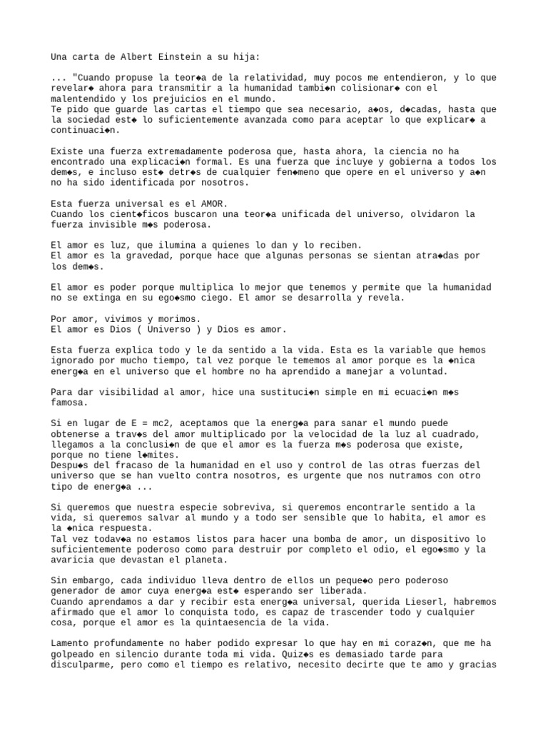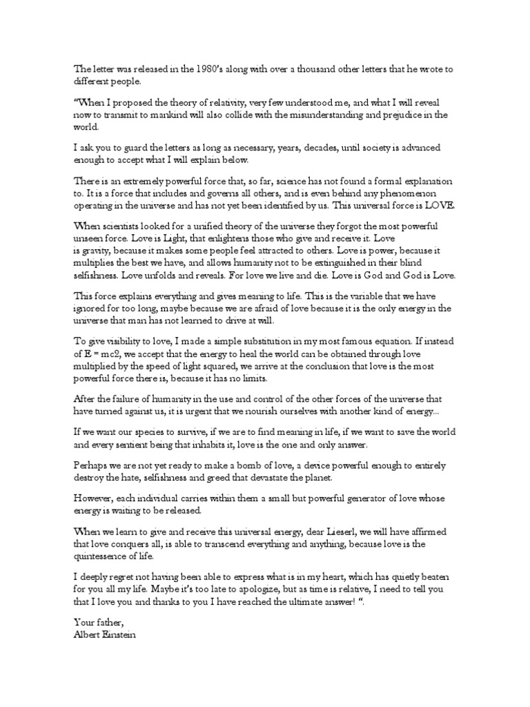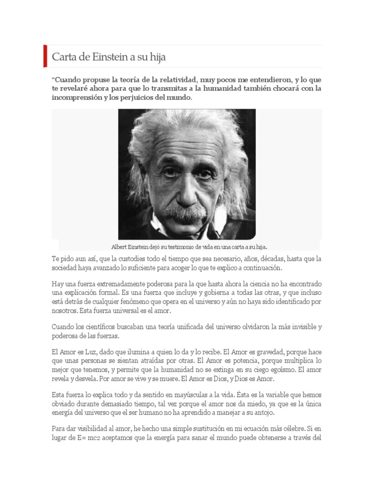 La autoría de esta carta que reproducimos a continuación está en entredicho pero sea o no de Einstein invitamos a su lectura. A Lieserl Einstein. "Cuando propuse la teoría de la relatividad, muy pocos me entendieron, y lo que te revelaré ahora para que lo transmitas a la humanidad también chocará con la incomprensión y los perjuicios.