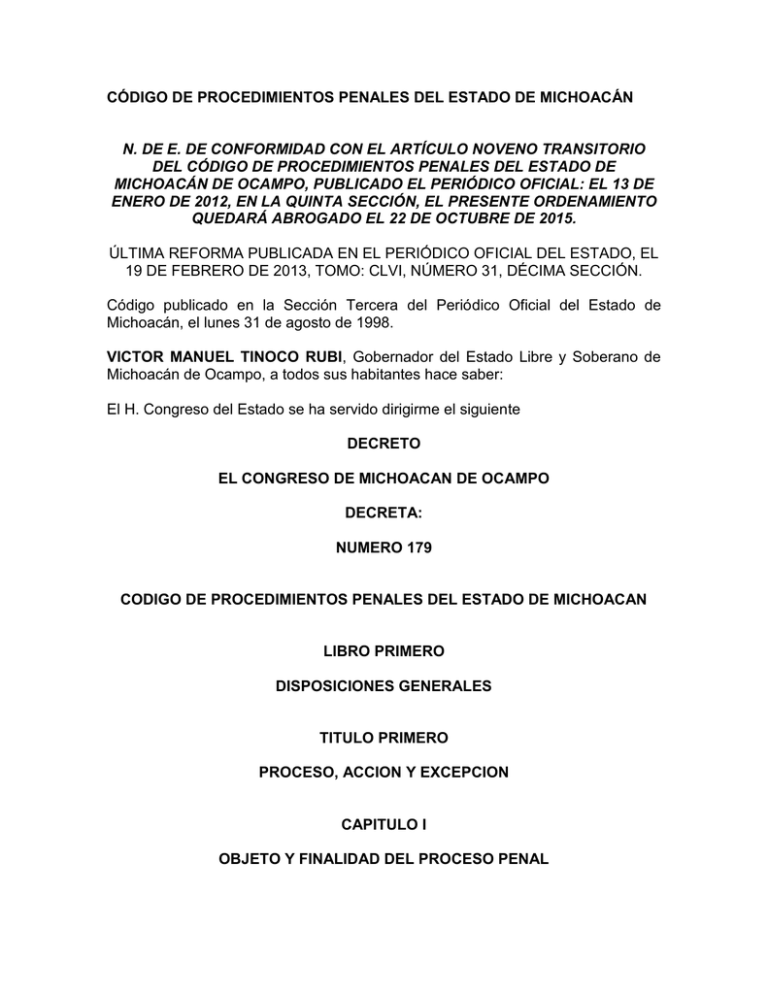 cÓdigo de procedimientos penales del estado de michoacÁn n. de e. de conformidad con el artÍculo noveno transitorio del cÓdigo de procedimientos penales del estado de michoacÁn de ocampo, publicado el periÓdico oficial: el 13 de enero de 2012, en la quinta secciÓn, el presente ordenamiento quedarÁ abrogado el 22 de octubre de 2015.