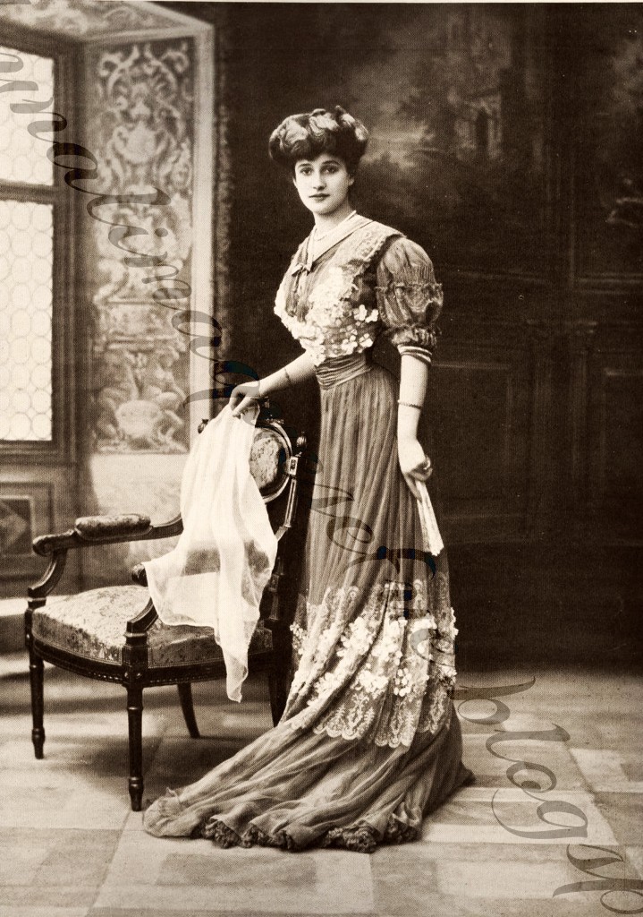 La estilizada, espiritual, elegantísima y algo decadente duquesa de Portland, es uno de los ejemplos más emblemáticos del atuendo de las clases altas en la década de 1900-1910. Pero no nos engañemos: luce un atuendo de fantasía, acaso realizado para un baile de disfraces y de ahí su alto cuello de armado encaje, inspirado en la moda del.