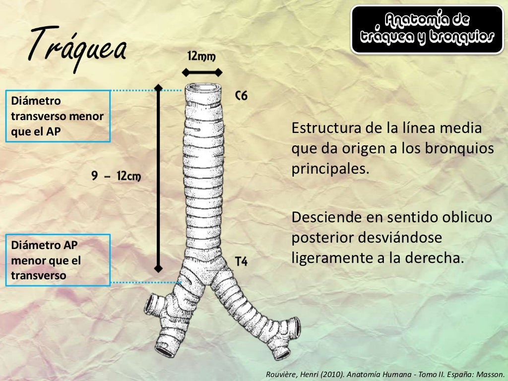 Section snippets Introducción. La tráquea es un conducto respiratorio situado delante del esófago y se extiende desde la laringe hasta la 5. a vértebra torácica, donde se divide para formar los bronquios principales derecho e izquierdo. La pared de la tráquea está revestida de una membrana mucosa sostenida por anillos cartilaginosos abiertos hacia atrás.