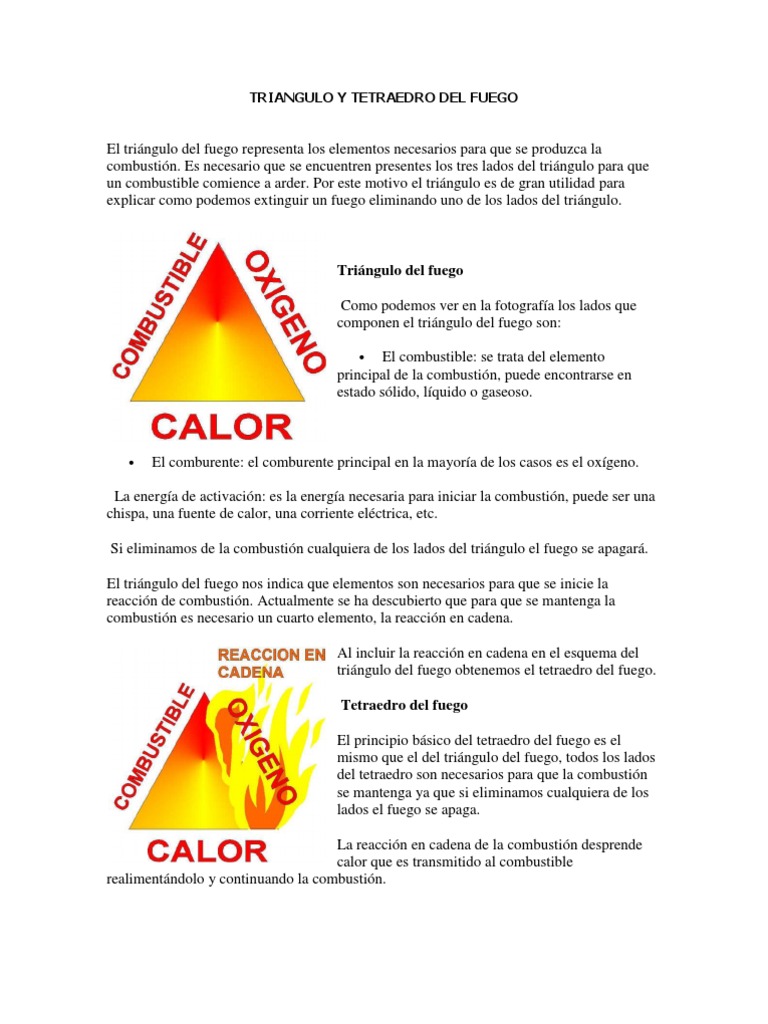 El Tetraedro de Fuego. Aunque el Triángulo de Fuego es un modelo clásico y ampliamente utilizado, el Tetraedro de Fuego añade un cuarto elemento crucial: la reacción en cadena. Además de combustible, comburente y calor, el Tetraedro de Fuego incluye la reacción química como un factor determinante para la propagación y extinción del fuego.