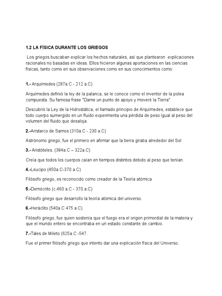 Los griegos (XII) hicieron algunas aportaciones a las ciencias físicas, tanto en sus observaciones como en sus conocimientos, olvidaron llevar sus teorías al campo de la experimentación lo que causo que interpretaran de forma errónea las leyes de la naturaleza.
