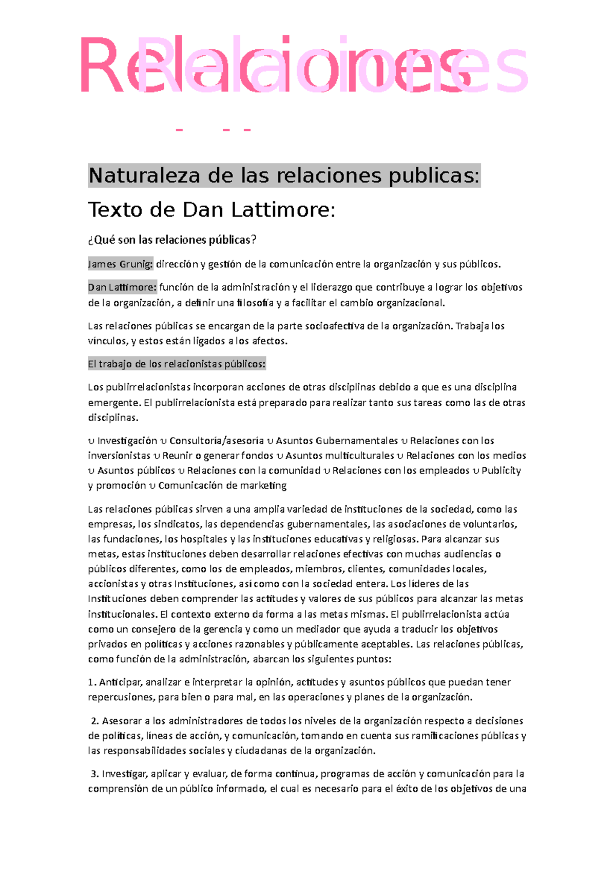 Resumen RRPP primer parcial Naturaleza de las relaciones publicas Texto de Dan Lattimore