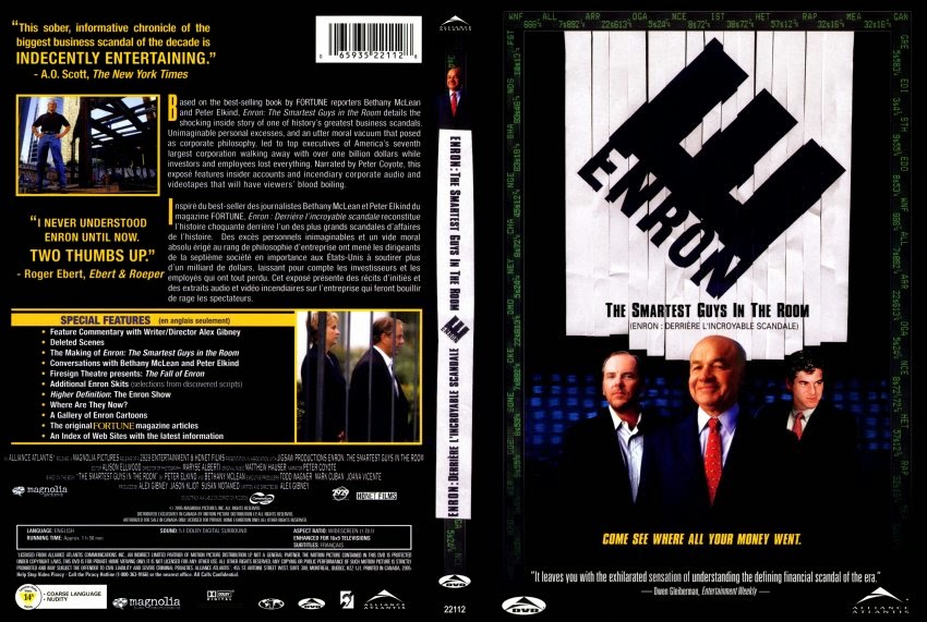 Enron, los tipos que estafaron a América. Alex Gibney. Libro: Bethany McLean, Peter Elkind. Relata el caso de la empresa Enron Corporation que, en quince años, pasó de ser una pequeña empresa de gas de Texas a convertirse en el séptimo grupo empresarial de mayor valor en Estados Unidos, y que acabó en la quiebra absoluta dando lugar a uno.