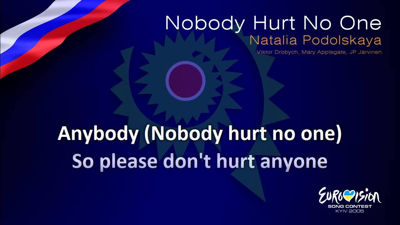 Natalia Podolskaya Natalia Podolskaya. Lyrics of Nobody Hurt No One. The official lyrics of Nobody Hurt No One are not (yet) available. Related posts. Read all the latest news. Story. Russia. Manizha's 'Russian Woman' wins on International Women's Day. 3 years ago. Story. #EurovisionAgain travels back to Ukraine 2005.