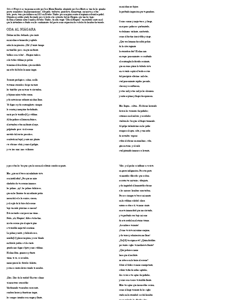 Niágara (1825) by José María Heredia. arder la inspiración. ¡Oh, cuánto tiempo. me robó del dolor la mano impía. y de entusiasmo ardiente mi alma llena. ansié por lo terrífico y sublime. la profunda impresión que tu grandeza. como el destino irresistible y ciego.