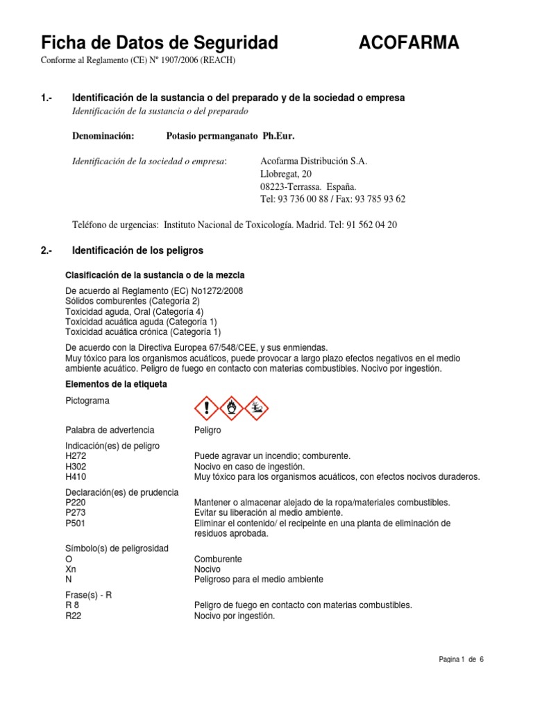 Hoja de seguridadPermanganato de potasio SECCIÓN 1 Identificación de la sustancia o la
