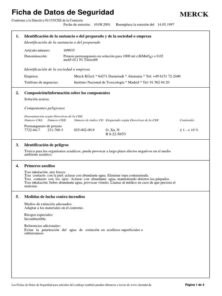 Material Safety Data Sheet or SDS for Potasio permanganato 105082 from Merck for download or viewing in the browser. Número de catálogo 105082. Nombre del producto Potasio permanganato. Seleccione el idioma. Si no puede ver la MSDS, utilice este enlace para descargársela: Descargar MSDS.