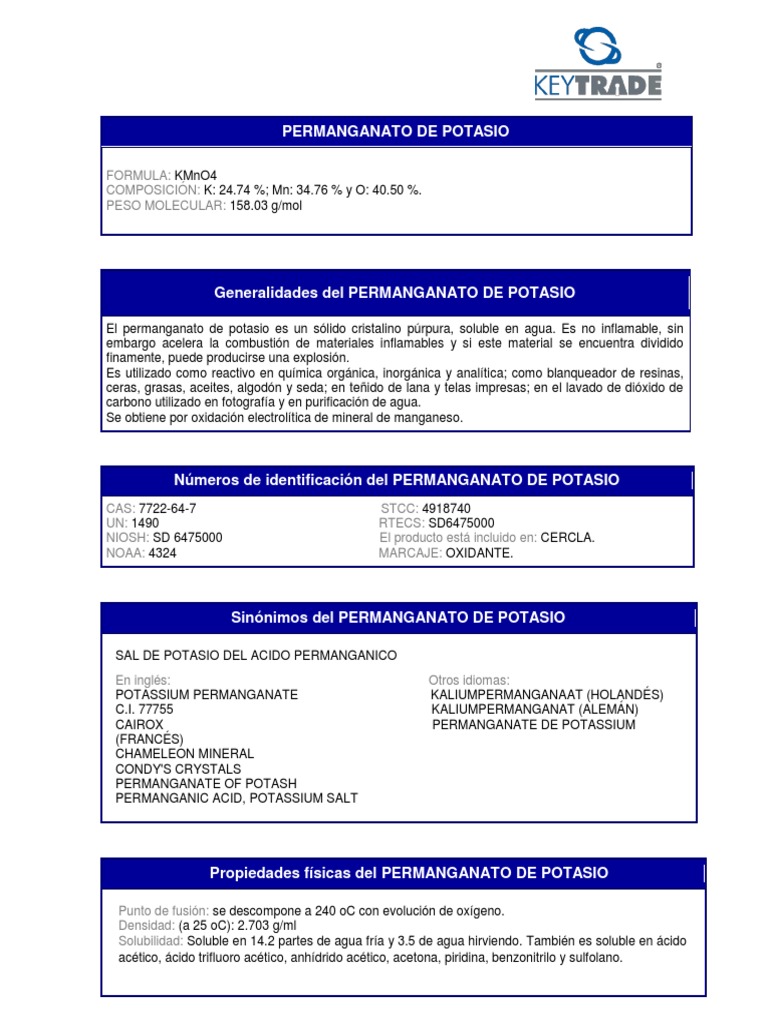 El permanganato de potasio es un sólido cristalino púrpura, soluble en agua. Es no inflamable, sin embargo acelera la combustión de materiales inflamables y si este material se encuentra dividido finamente, puede producirse una explosión. Es utilizado como reactivo en química orgánica, inorgánica y analítica; como blanqueador de resinas.