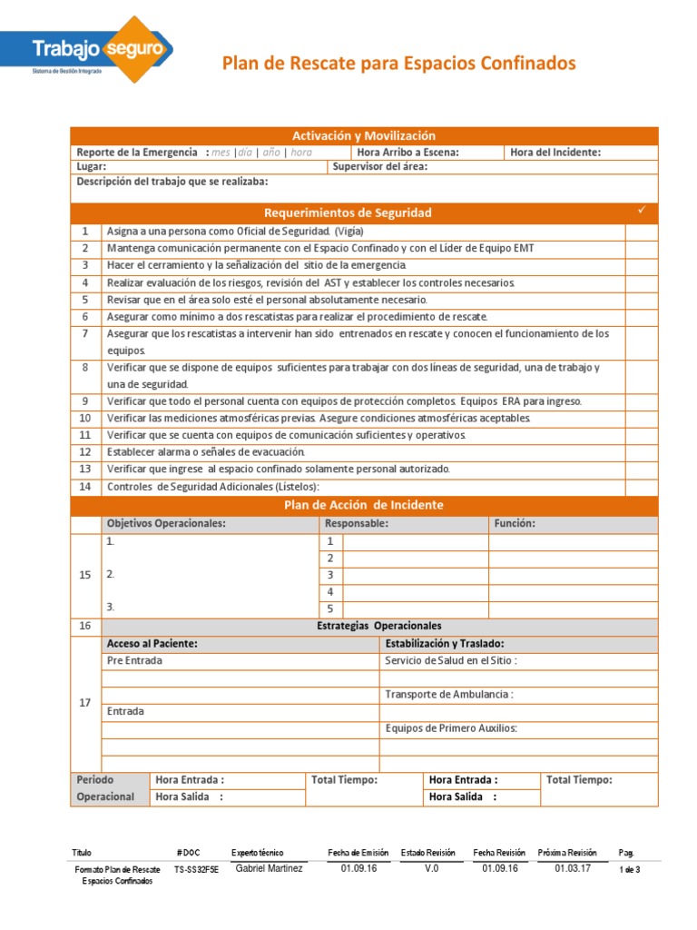 La "Guía para los trabajos en espacios confinados" del Instituto de Salud Pública de Chile, está dirigida a. PLAN DE ATENCIÓN A EMERGENCIAS Y RESCATE Es importante que existan procedimientos escritos en los que se detallen los pasos a seguir en caso de producirse una emergencia, en el cual estén previstos la actuación.